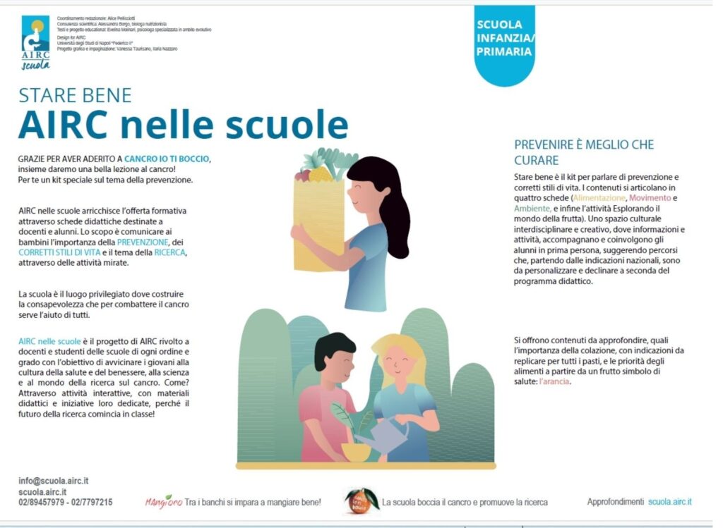 Tutte le scuole dell’Istituto Comprensivo aderiscono all’iniziativa “Cancro io ti boccio”, il progetto che AIRC ha studiato per le scuole, unitamente all’iniziativa “Le Arance della Salute”.