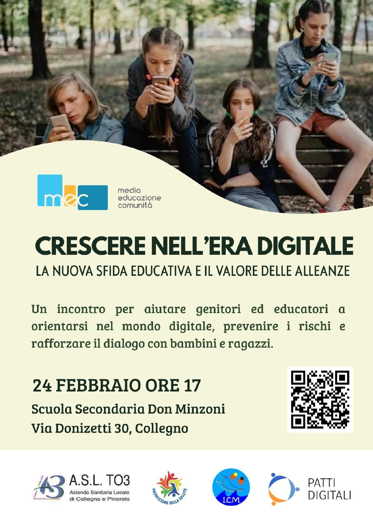 Si comunica alle SS.LL che il giorno 24 febbraio 2026 dalle ore 17.00 alle ore 19.00 nell’aula Magna della scuola Don Minzoni si terrà un incontro dell’associazione MEC, promosso dall’ Aslto3, sull’impatto delle tecnologie digitali nello sviluppo di bambini e adolescenti.
